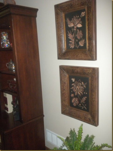 So that you can get a feel for the area (I’m certainly open to suggestions!!) here is what is on the wall directly in front of the two chairs. I do love these screen prints. There is a guest room to the left and the bathroom is to the right.